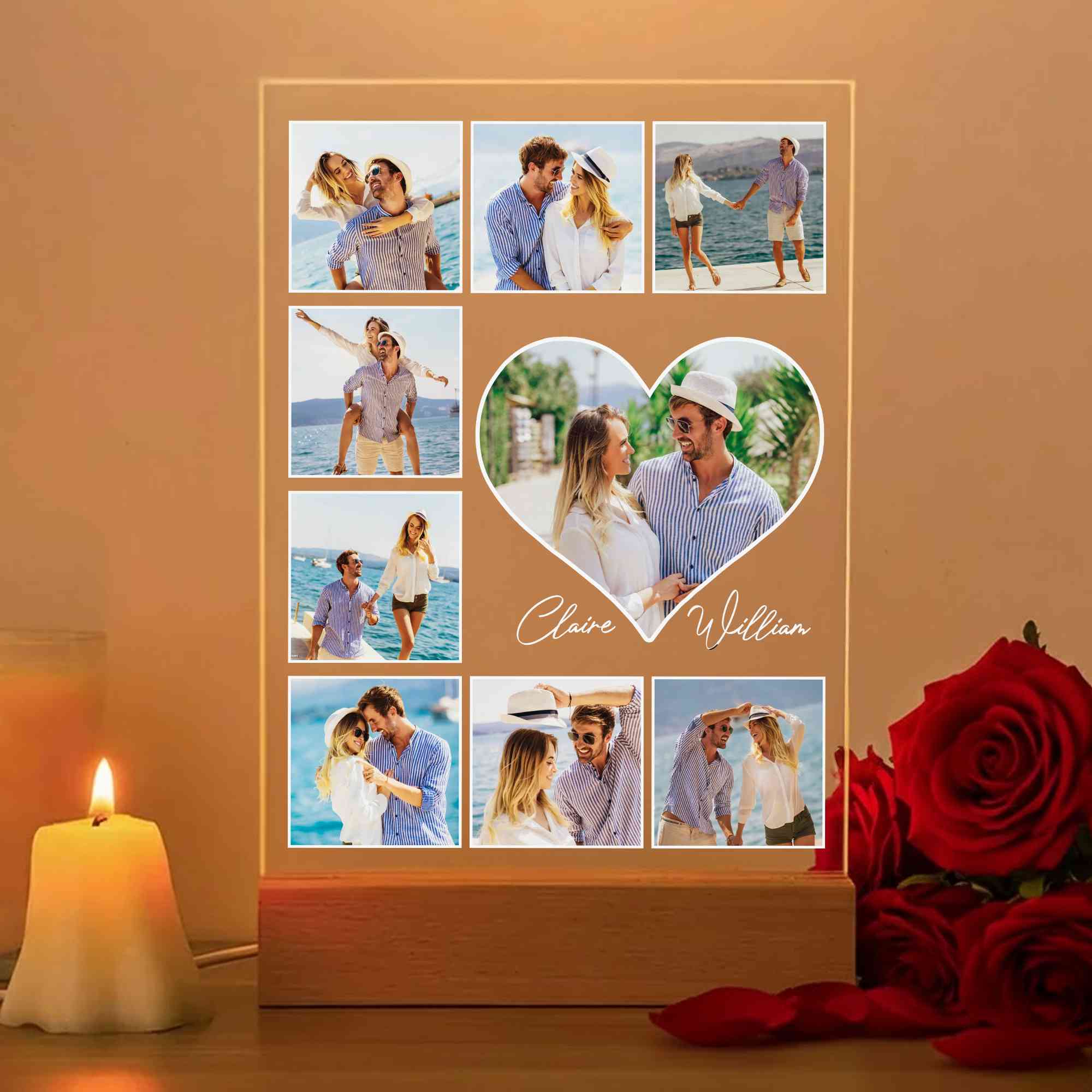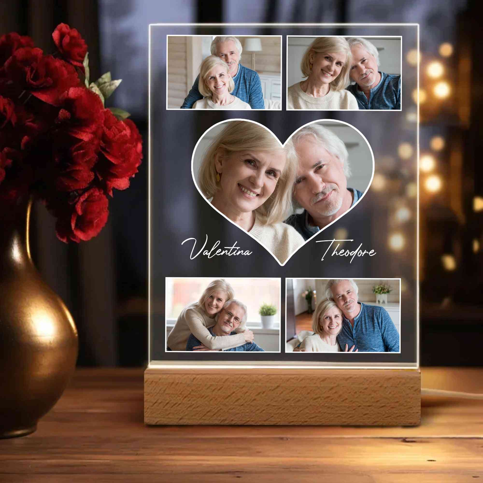 Heartfelt Couple’s Design - This personalized night light features a sweet couple-themed layout that highlights your favorite photos and couple's names, bringing a warm and intimate glow to any room. The clean acrylic shape paired with a wooden base adds a modern touch that fits effortlessly into different décor styles.
